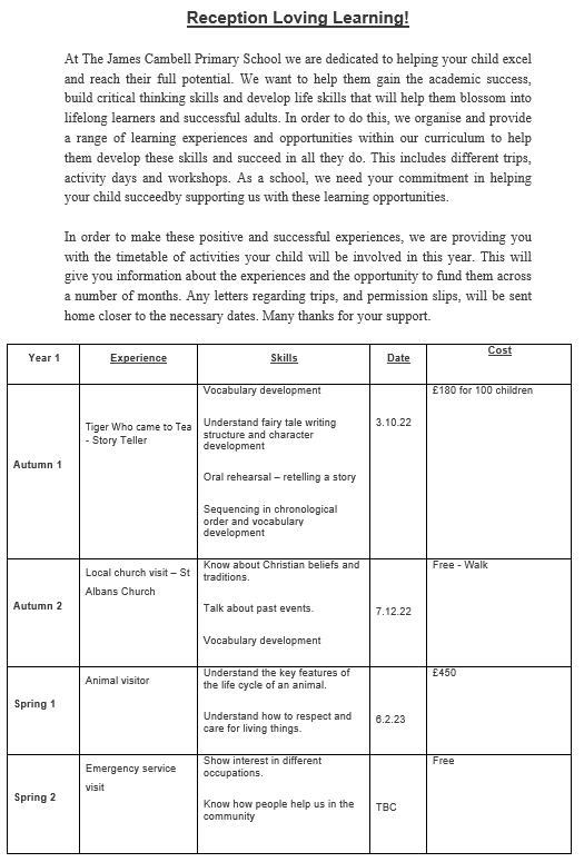 At James Cambell Primary School, we are dedicated to providing your child with opportunities they deserve. We want to help them gain the academic success, build critical thinking skills and develop life skills that will help them blossom into lifelong learners and successful adults. In order to do this, we organise and provide a range of learning experiences and opportunities within our curriculum to help them develop these skills and succeed in all they do. This includes different trips, activity days and workshops. As a school, we need your commitment in helping your child succeed by supporting us with these learning opportunities.