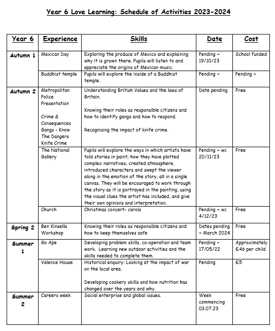 In order to make these positive and successful experiences, we are providing you with the timetable of activities your child will be involved in this year. This will give you information about the experiences and the opportunity to fund them across a number of months. Any letters regarding trips, and permission slips, will be sent home closer to the necessary dates. We are very grateful for your financial contributions that make these experiences possible for your children. Many thanks for your support.